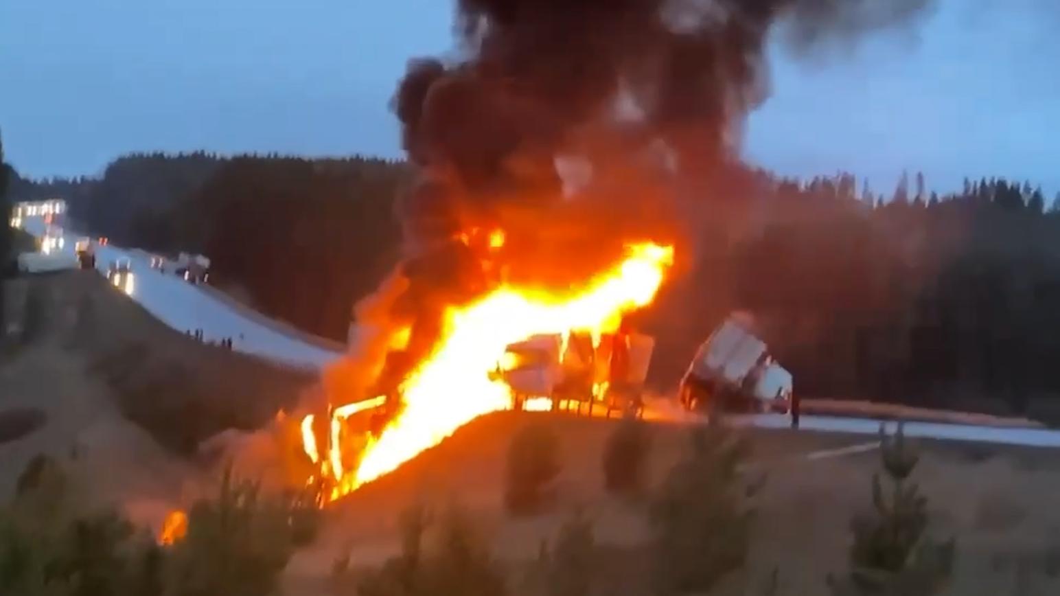 В Иркутской области из-за сгоревших фур и крупного ДТП перекрыли трассу
